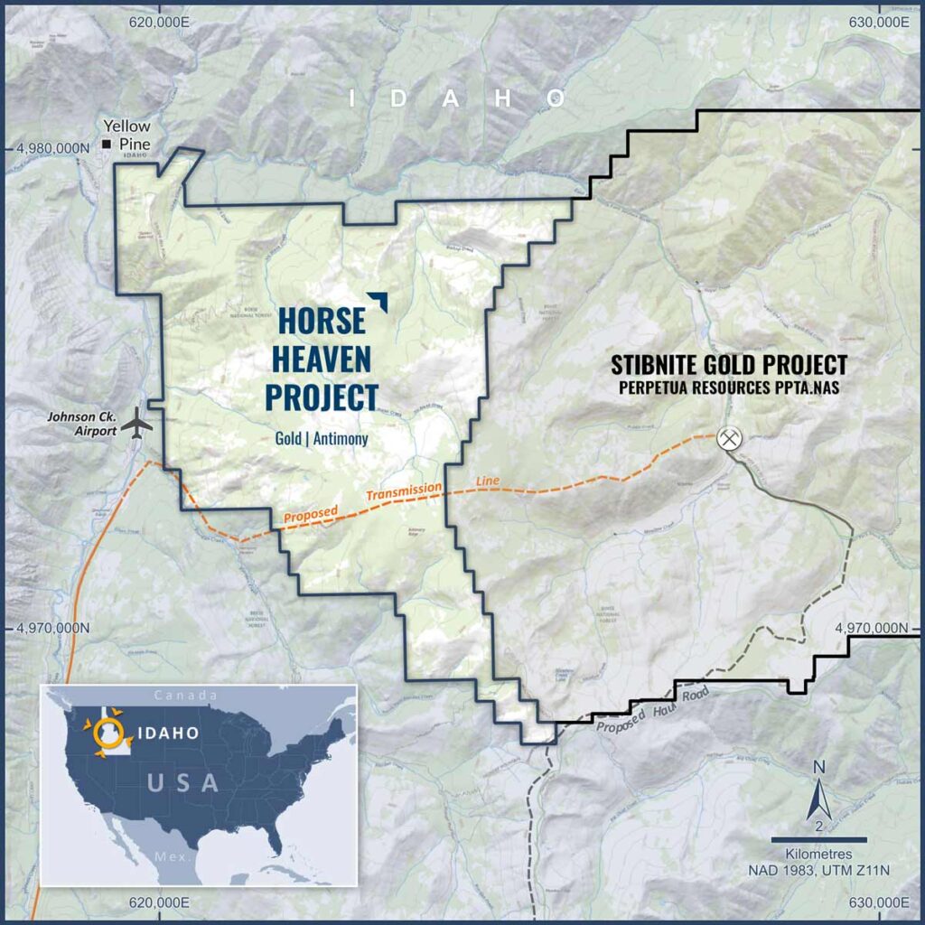 The Horse Heaven Antimony-Gold-Tungsten Project is well-situated in Valley County, Idaho USA, sharing its eastern boundary with Nasdaq-listed Antimony giant Perpetua Resources’ (~A$2 billion market cap) Stibnite Gold Project. Stibnite hosts a 4.8M ounce Gold reserve and a significant endowment of Antimony and tungsten.