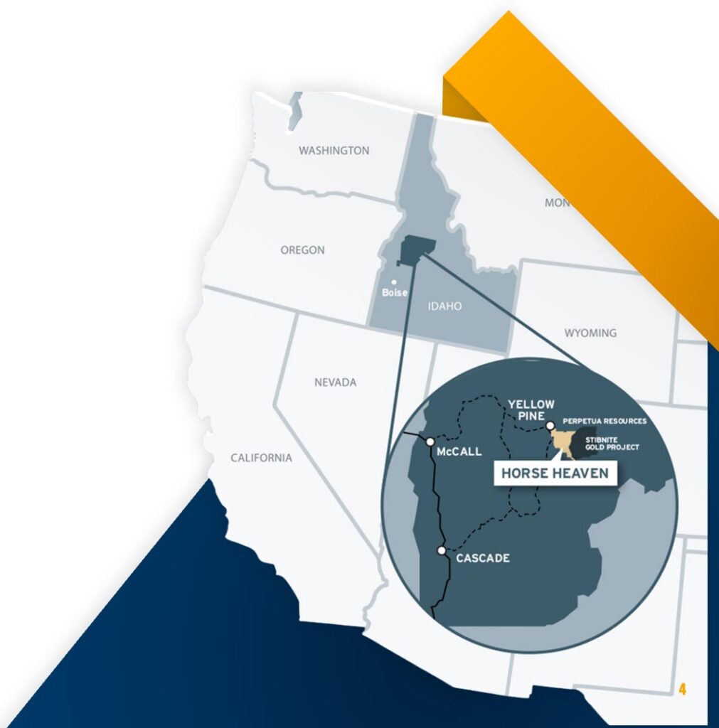 Horse Heaven shares its eastern boundary with Perpetua Resources’ Stibnite Gold Project. Due to its high grade and low strip ratio, Stibnite is set to become one of the largest high-grade, low-cost gold mines in the USA and the only domestic source of antimony. Stibnite boasts 6M oz of Measured & Indicated gold reserves, with antimony and tungsten being “by-products.”