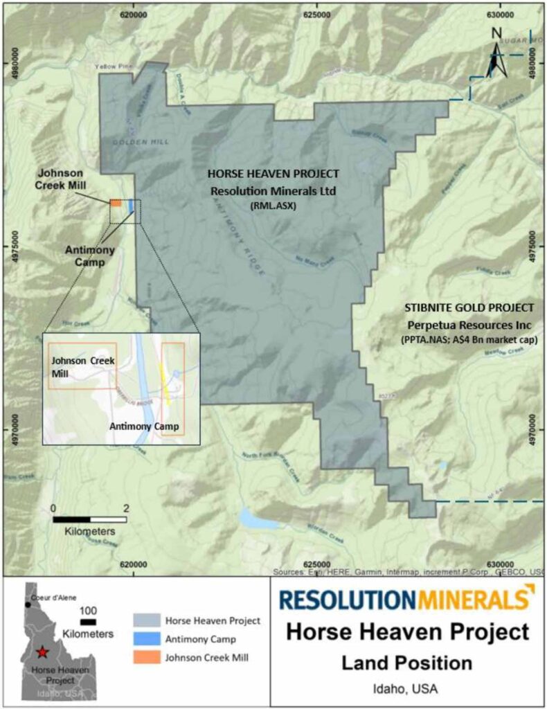 - The processing mill and stockpiles sit on 25 acres of private land directly adjoining RML’s Horse Heaven Gold-Tungsten-Antimony Project, situated adjacent to Perpetua Resources Inc’s A$4 billion Stibnite Project in Idaho, USA.